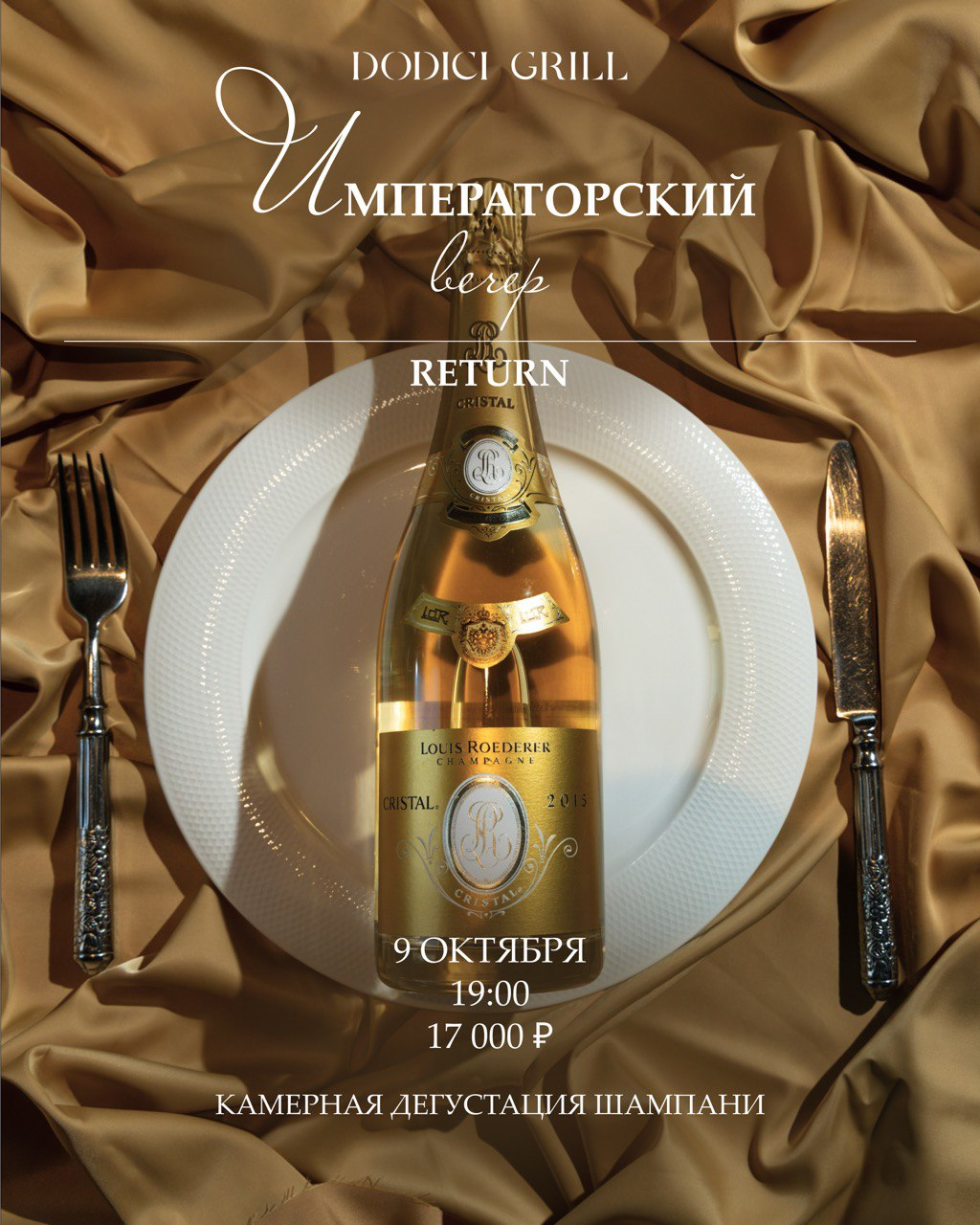 Бриллиантом вечера станет Cristal Louis Roederer Brut 2015 — вино, созданное по заказу императора Александра II. Хрустальная бутылка, герб Российской Империи, насыщенный вкус — это шампанское считается одним из самых престижных и элитных в мире. Cristal — это то вино, которое точно стоит попробовать однажды.